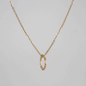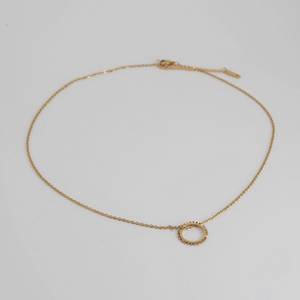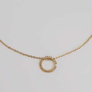Delikat gullkjede med rund medaljong med teksten "What goes around comes around" skrevet rundt. Kan brukes alene og sammen med andre halskjeder.